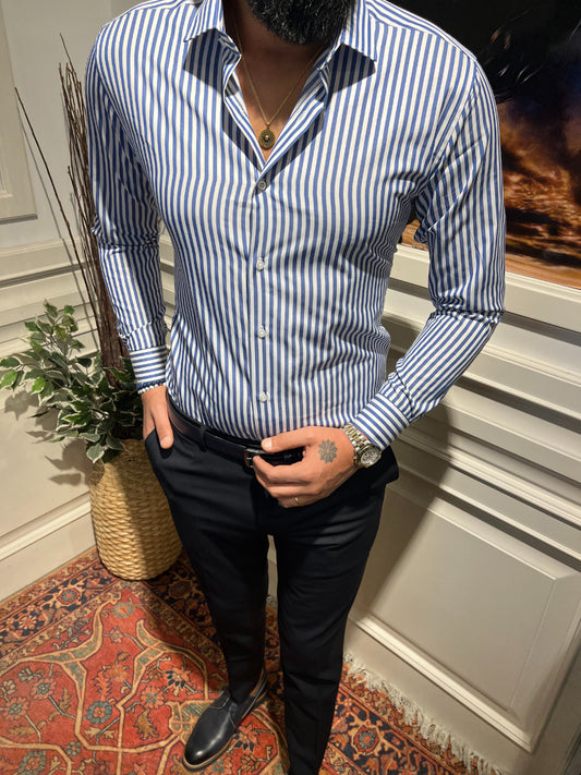 Guild Slim Fit Pamuk Çizgili KING Mavi Gömlek 7036