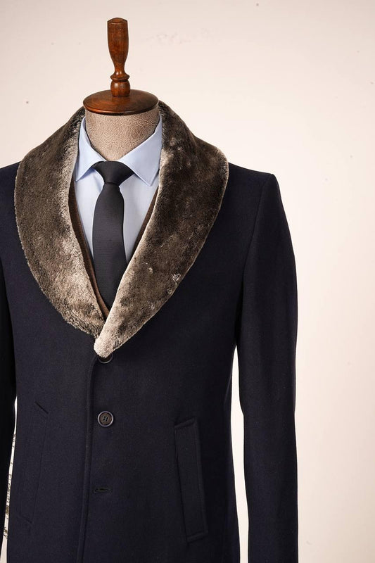 Guild Hagen Yaka Kürklü Kaşe Lacivert Kaban