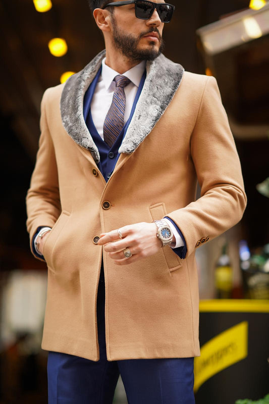 Guild Hagen Yaka Kürklü Kaşe Bej Kaban